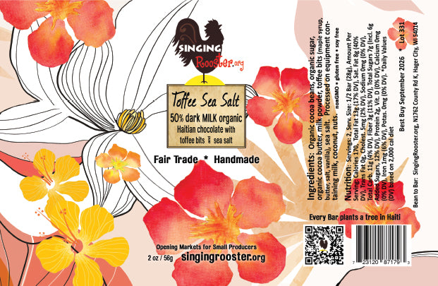Toffee Sea Salt: 50% Dark - Organic Haitian Cocoa Beans, Organic Cane Sugar, Organic Cocoa Butter, Organic Milk Powder, Toffee bits (maple syrup, butter, sea salt, vanilla), Sea Salt