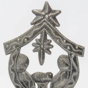 This lovely standing nativity metal art is made from recycled oil drums and crafted completely by hand by talented artisans in Haiti. This piece measures 5" wide x 6.5" tall and we think it makes the perfect small gift or a fun detail for a mantel, centerpiece or coffee table.