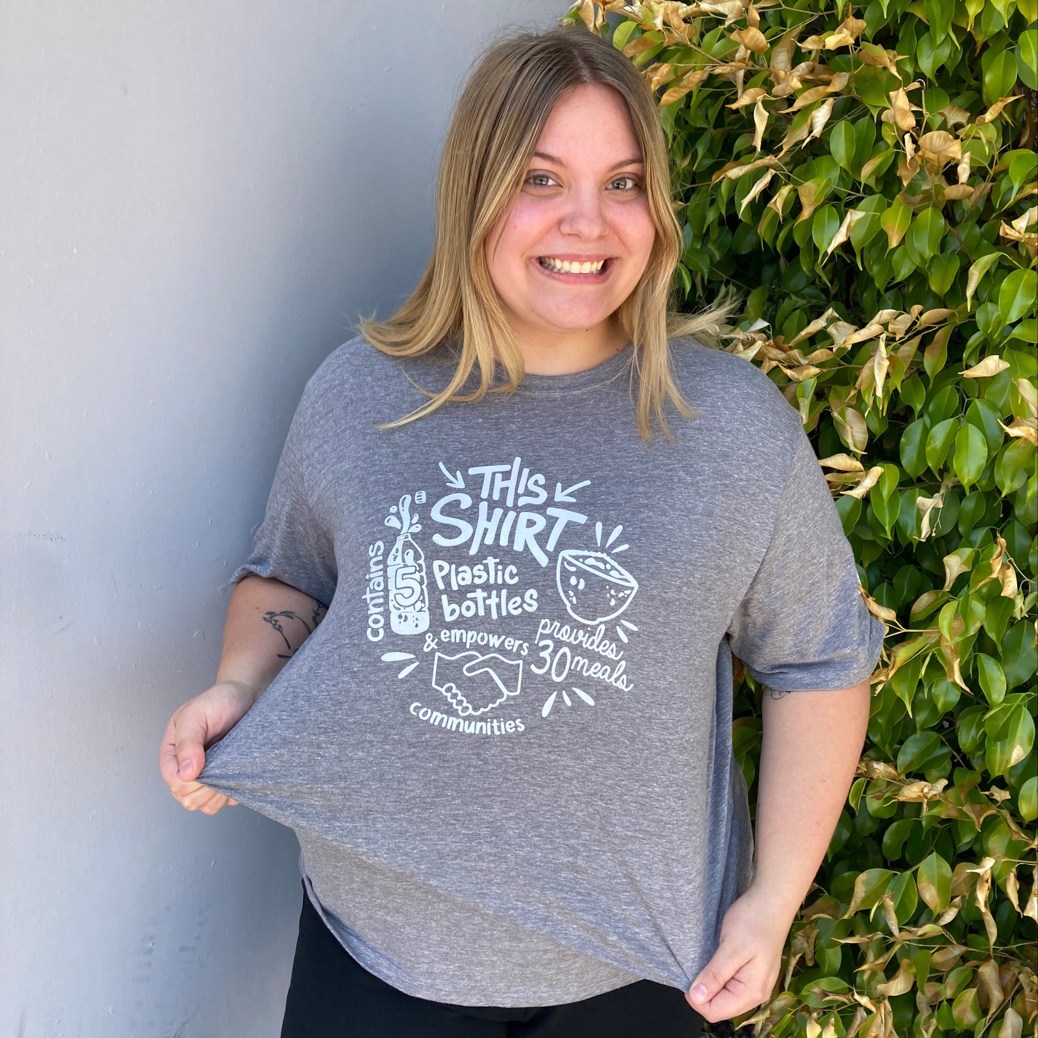 These tri-blend shirts are made from US-grown cotton, recycled polyester, and rayon. Every shirt contains the equivalent of approximately 5 plastic water bottles!
