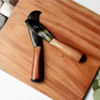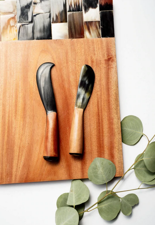 These full tang horn cheese utensils with wooden grip will take your cheese board game to the next level! Pair them with the matching Wood and Horn Serving Board for all your charcuterie needs.