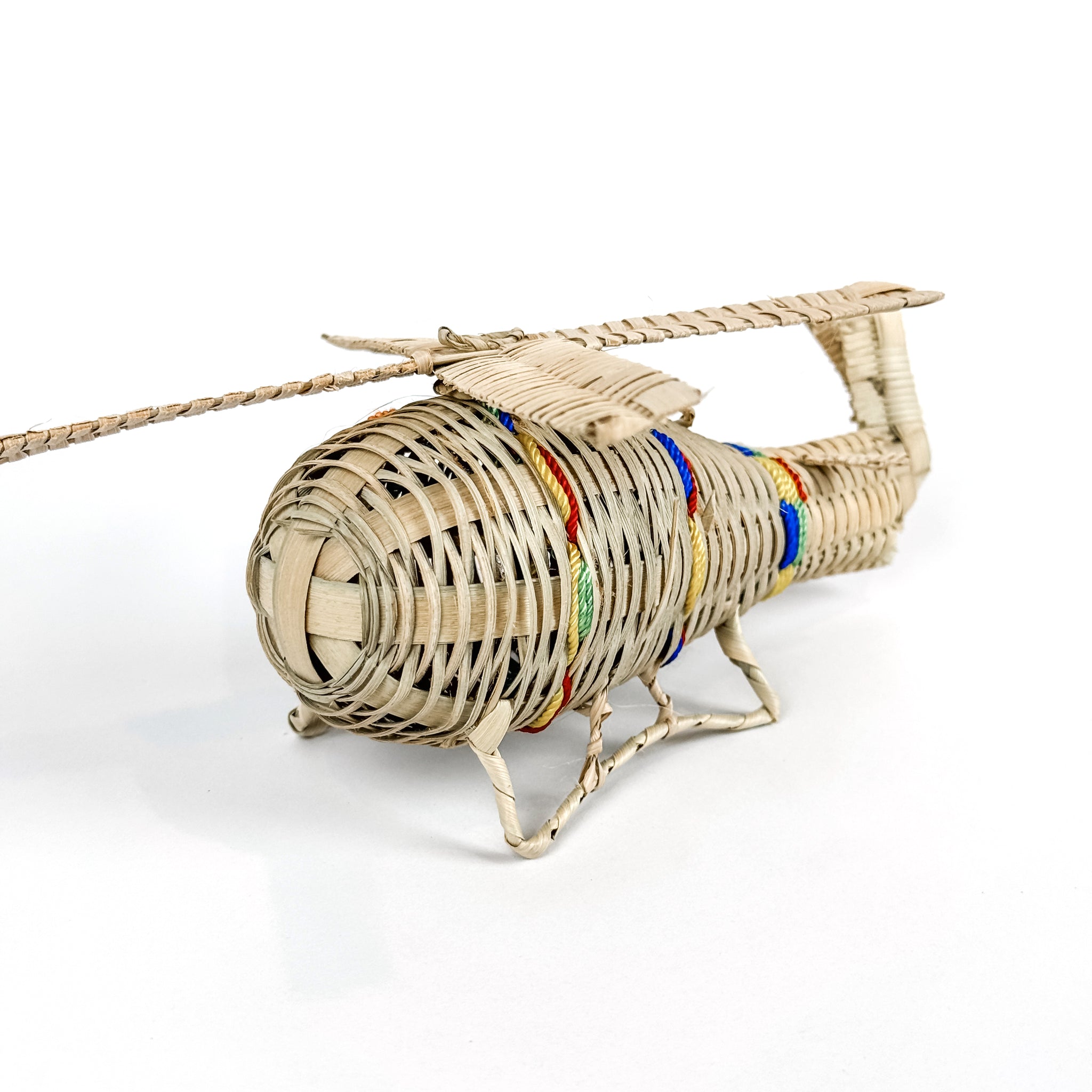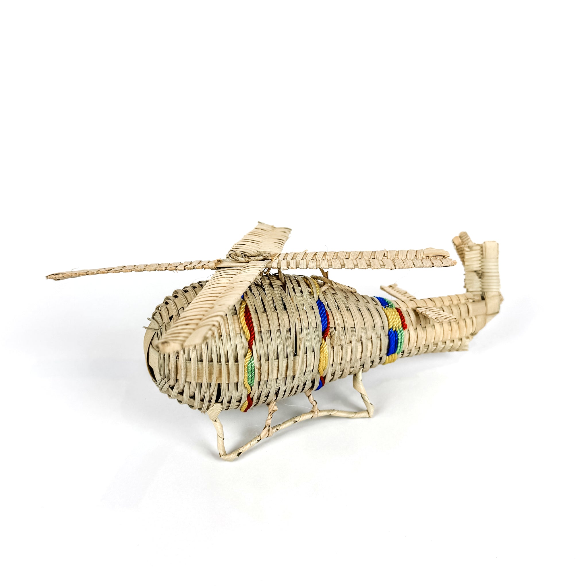 Each helicopter is meticulously woven by hand by The Women of San Juan. These artisans are part of an indigenous group in Honduras called the Tolupanes and come from the San Juan tribe. They live in a remote area called Montana De La Flor. Weaving is a handicraft that has been passed down through many generations. The suyate leaves used to make the baskets grows in the higher altitudes of Montana De La Flor and the women walk for several hours to pick it. It then has to be laid out to dry before being used to create the helicopters.