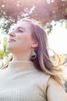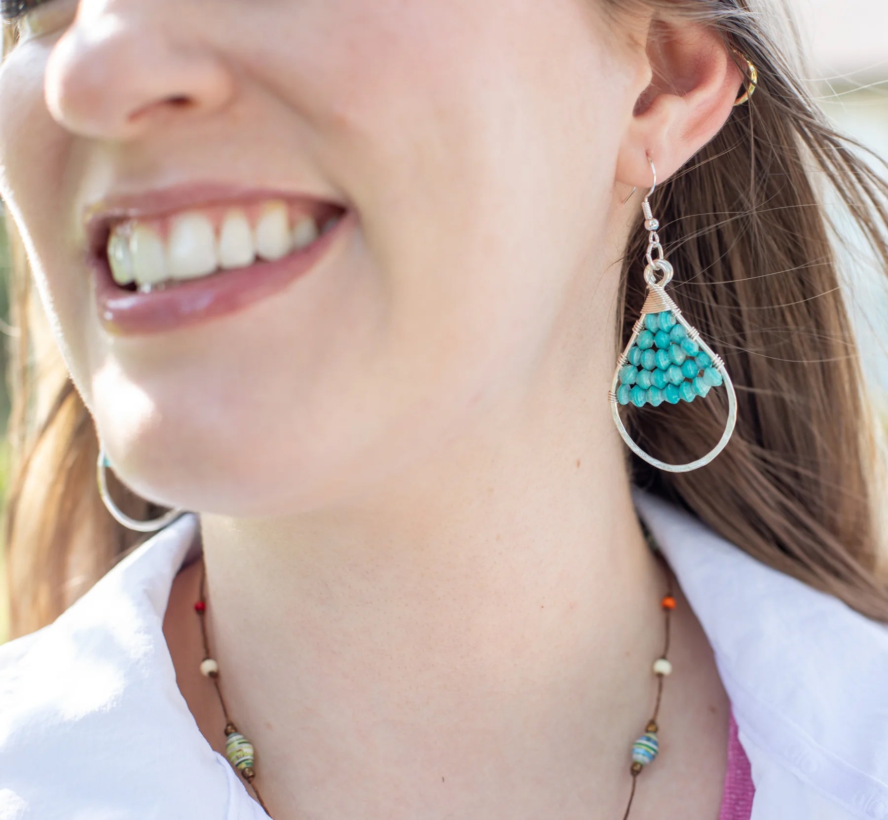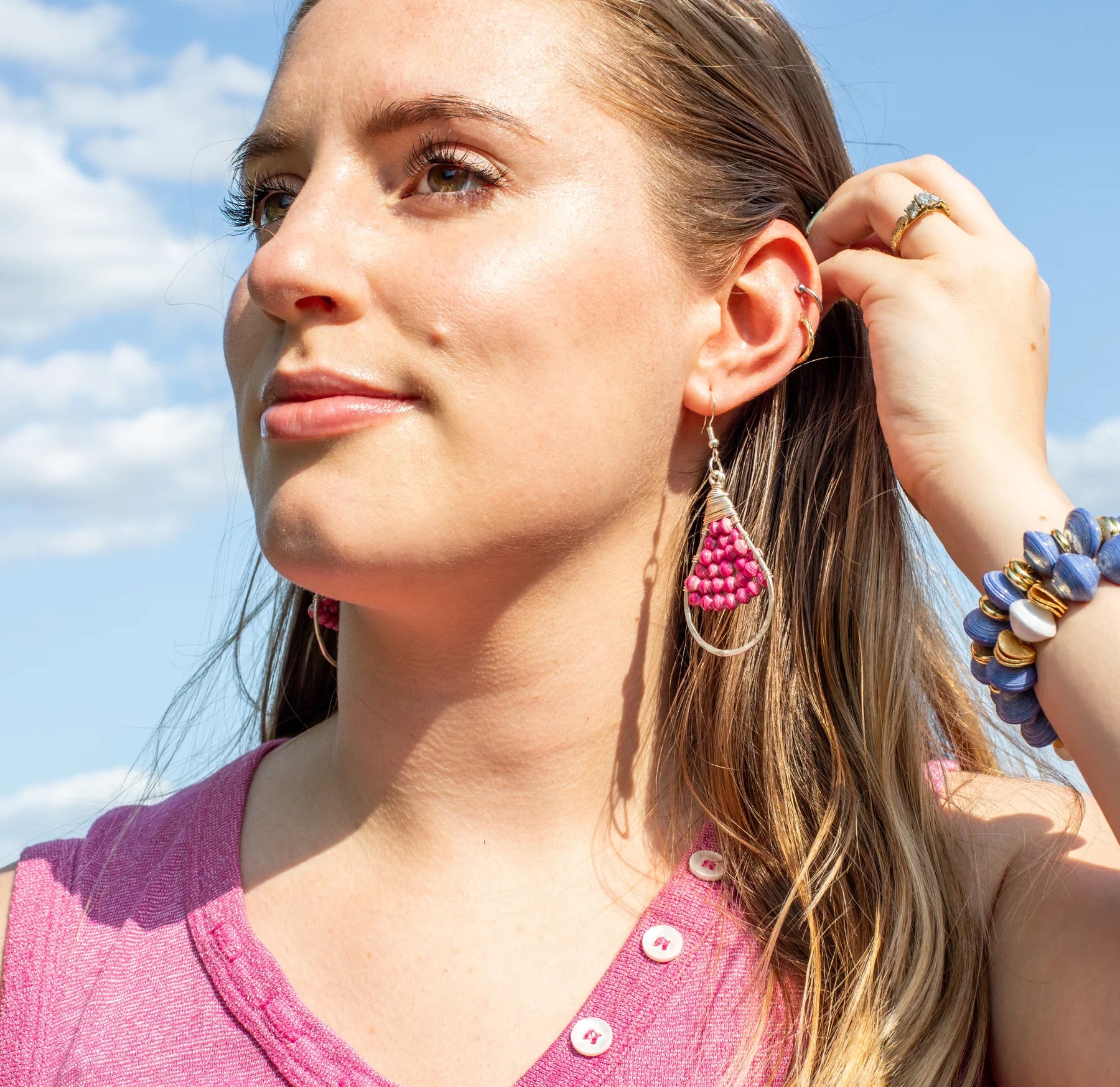 Maroon, Sage and Navy designs feature brass wire and a gold-filled earring hook. Pink and Turquoise designs feature silver plated copper wire and a sterling silver earring hook.